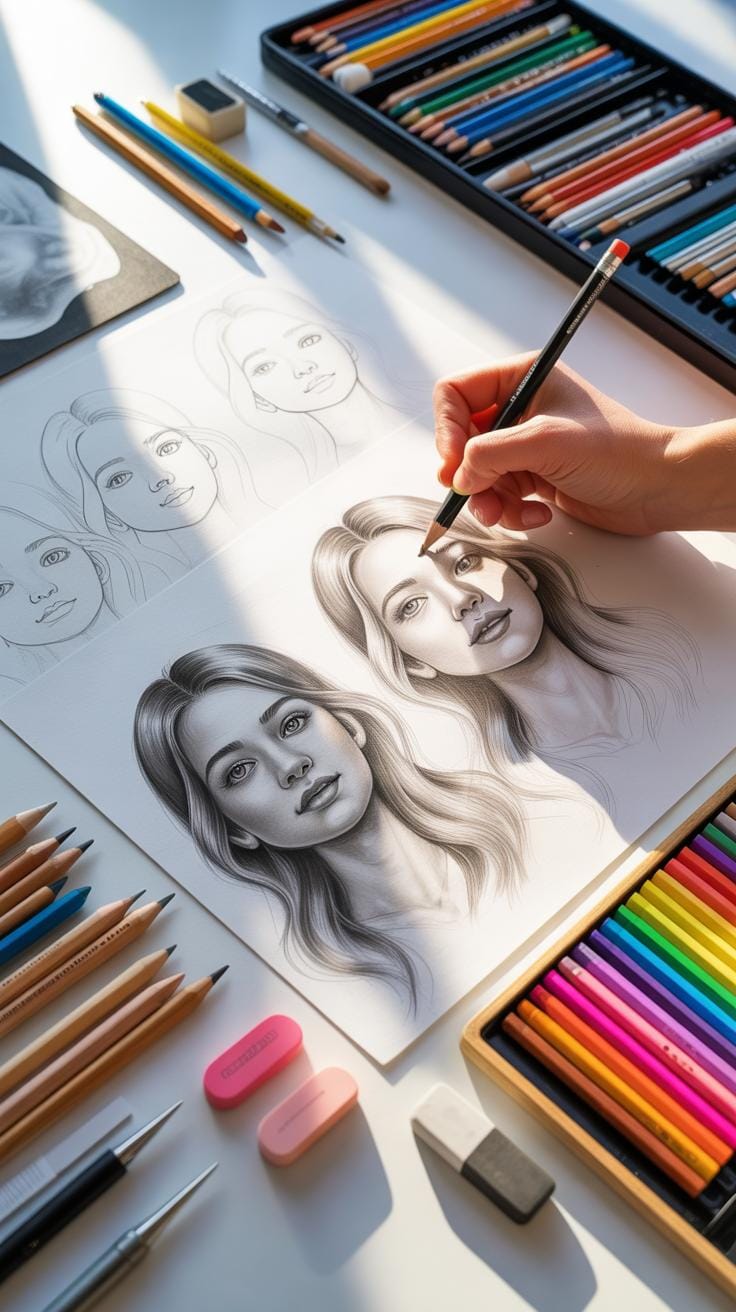 If you’re just beginning, simple tools are best. A few pencils of different hardness (like 2B and HB), a reliable eraser, and decent-quality paper are enough to get going. Why? Because pencils give you control; you can shade lightly or heavily, erase mistakes, and practice lines. The eraser becomes your safety net, encouraging experimentation without fear.