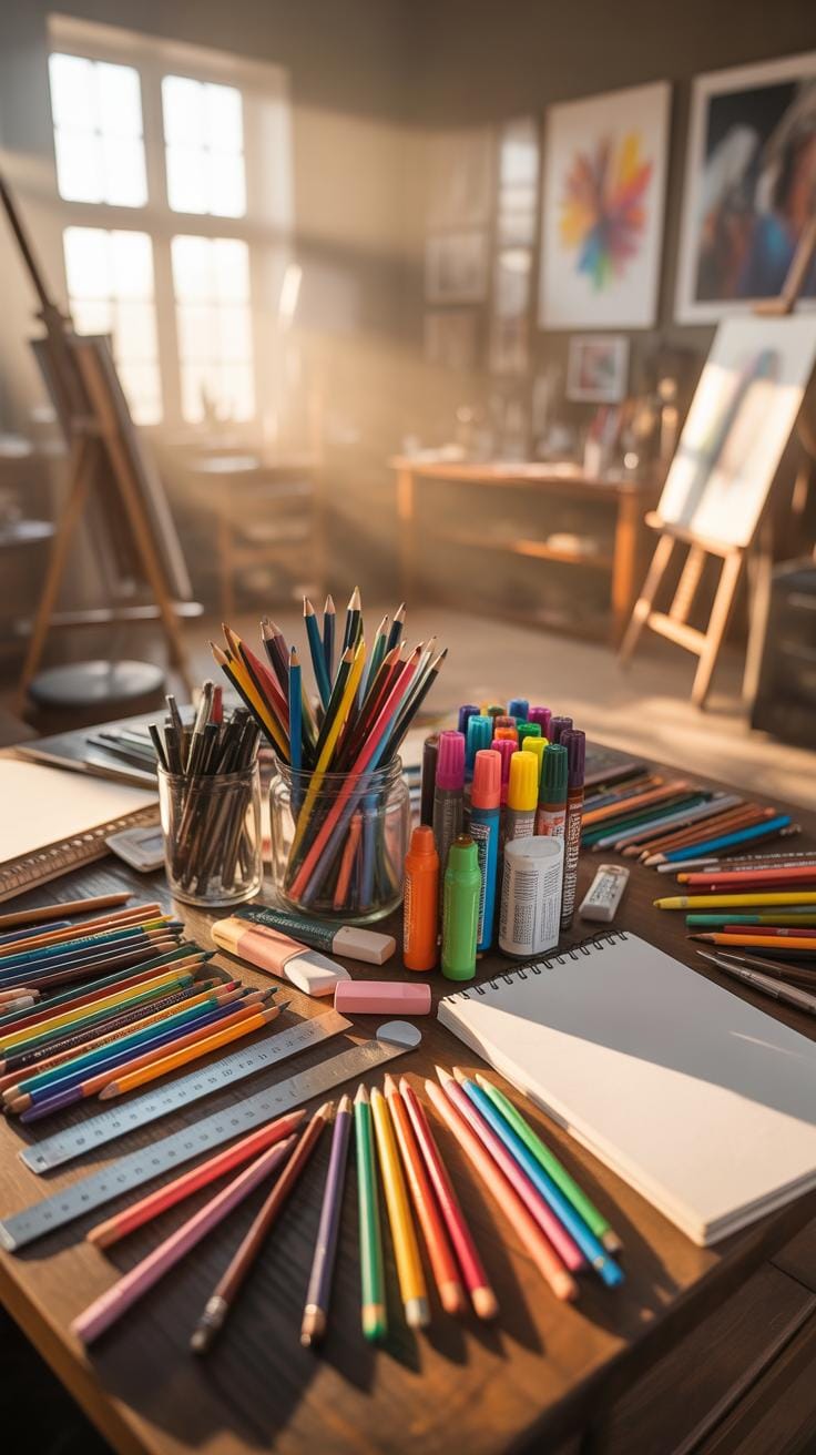Brushes, though more associated with painting, are used in drawing too, especially with ink or watercolor. Colored pencils add a layer of vibrancy and texture, letting you blend or layer colors without the mess of paint.