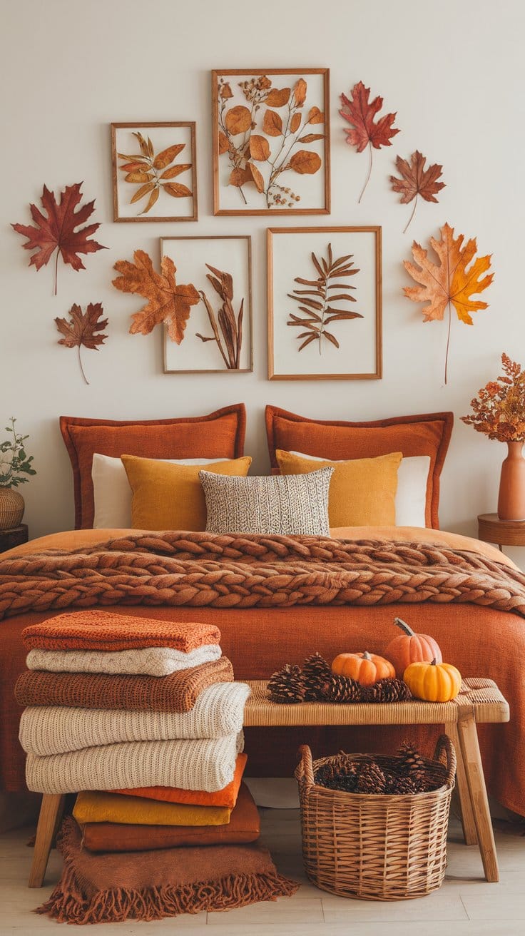 Autumn leaves and fall foliage are a simple yet effective way to bring nature into your home. Use them to decorate tables, mantels, or even frame them in beautiful wooden picture frames to create an autumn-inspired gallery wall. These natural elements provide an organic touch that pairs perfectly with rustic, vintage, or boho decor. Whether using real leaves from your yard or artificial ones, they instantly add a seasonal pop of color and texture to any room. This connection to nature not only brings in the essence of fall but also creates a calming and comforting environment in your home.