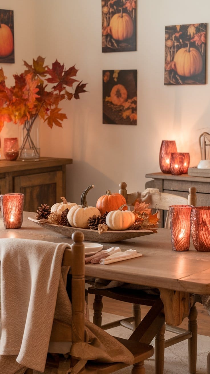 A pumpkin spice centerpiece with candles or small fall pumpkins can easily become the focal point of your dining table. The smell of pumpkin spice will fill your home with warmth and comfort.