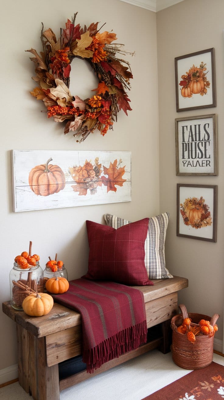 Simple rustic fall art prints or autumn-themed wall decor bring nature indoors without breaking the bank. Choose art featuring autumn leaves, pumpkins, or fall foliage to match your aesthetic.