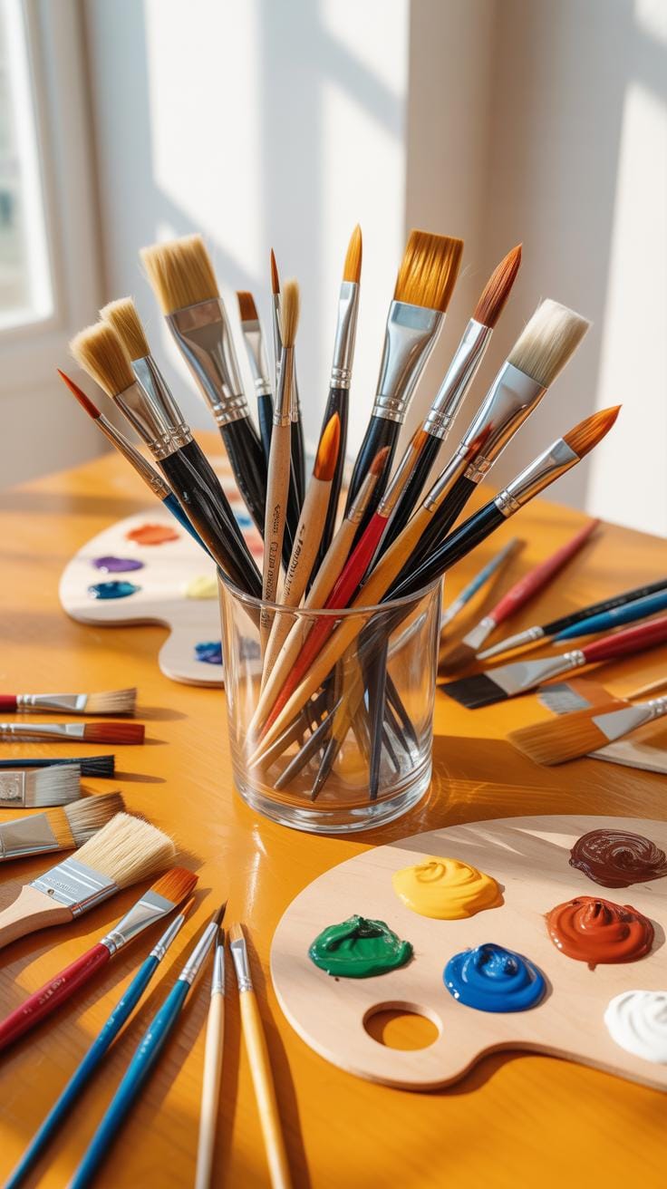 - Various brush shapes and sizes—flat, filbert, fan, round