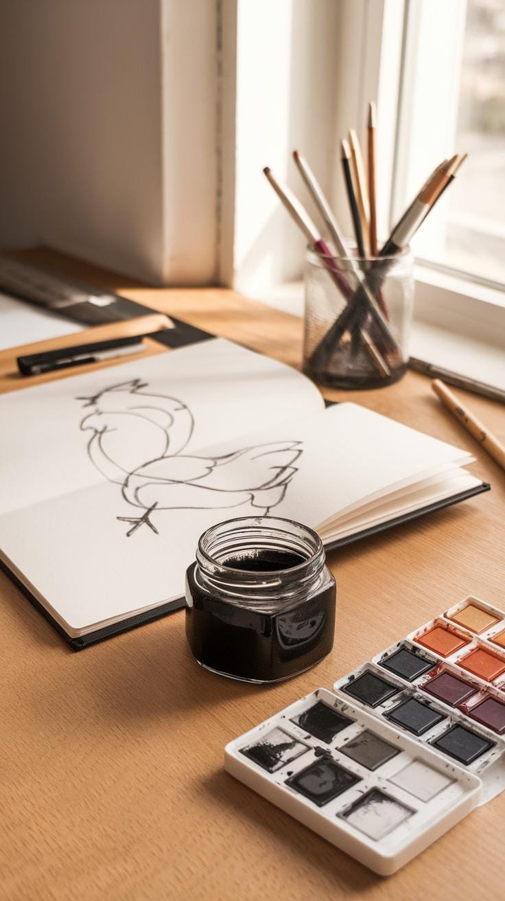 Painting chickens requires materials that capture fine details and vibrant colors. Gouache and ink wash fit this need well. Gouache is a water-based paint known for its bold opacity and quick drying time. It lets you layer colors smoothly, helping you highlight feathers, wattles, and beaks with precision. Ink wash uses diluted ink to create soft shadows and rich textures. When paired, these two techniques help bring out both the form and personality of chickens.