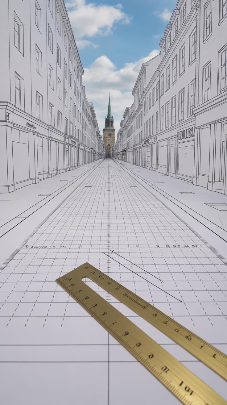 There are different types, like one-point, two-point, or even atmospheric perspective. I find one-point perspective useful when drawing a long street, making it easy to lead the eye far into the scene. Using perspective properly gives your city life and scale—it’s more than shapes on paper; it’s about feeling the space people move through.