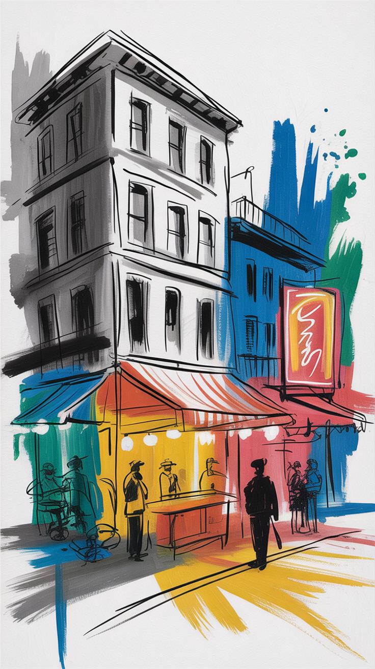 City drawing is more than copying buildings. It is about feeling and showing the city’s lively spirit. Different styles offer ways to express this energy, from careful lines to free shapes.