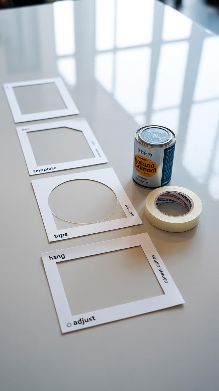 Use painter’s tape to attach the template squares on the wall, mimicking the layout you created. It’s like a rough sketch in place, giving you a chance to step back and assess before putting nails in. Move pieces around if something feels off; it’s easier now than after hanging frames.
