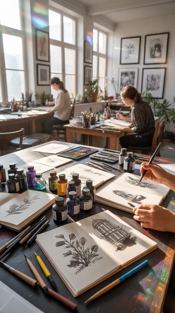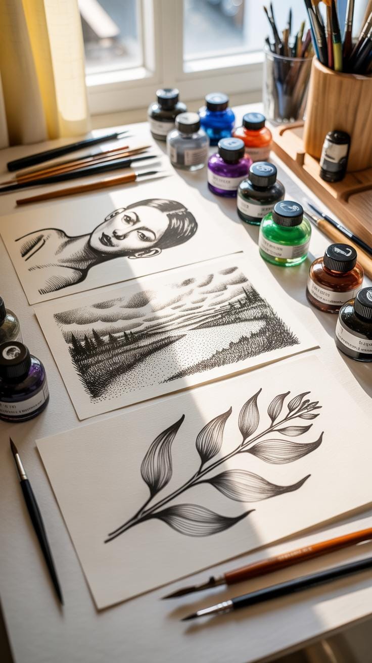 Ink drawing requires patience and practice but can produce remarkable results with the right techniques. By selecting proper tools and methods, you can create strong lines and delicate shading that bring your ideas to life. Your attention to detail will increase as you explore various styles like cross-hatching and stippling.