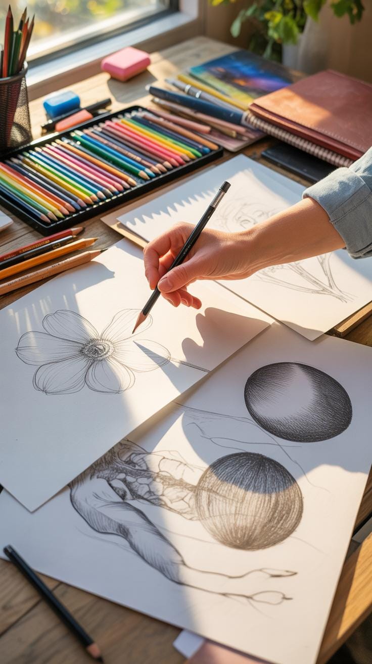 Lines also do more than outline shapes—they show form and texture. Curved lines can suggest volume by following an object’s contours, while short, varied strokes mimic roughness or subtle shading. For instance, crossing lines tightly layered can make shadows, while feathered lines suggest softer edges. Sometimes, blending these approaches creates a more believable surface, though that depends on how subtle or bold you want your drawing to feel.