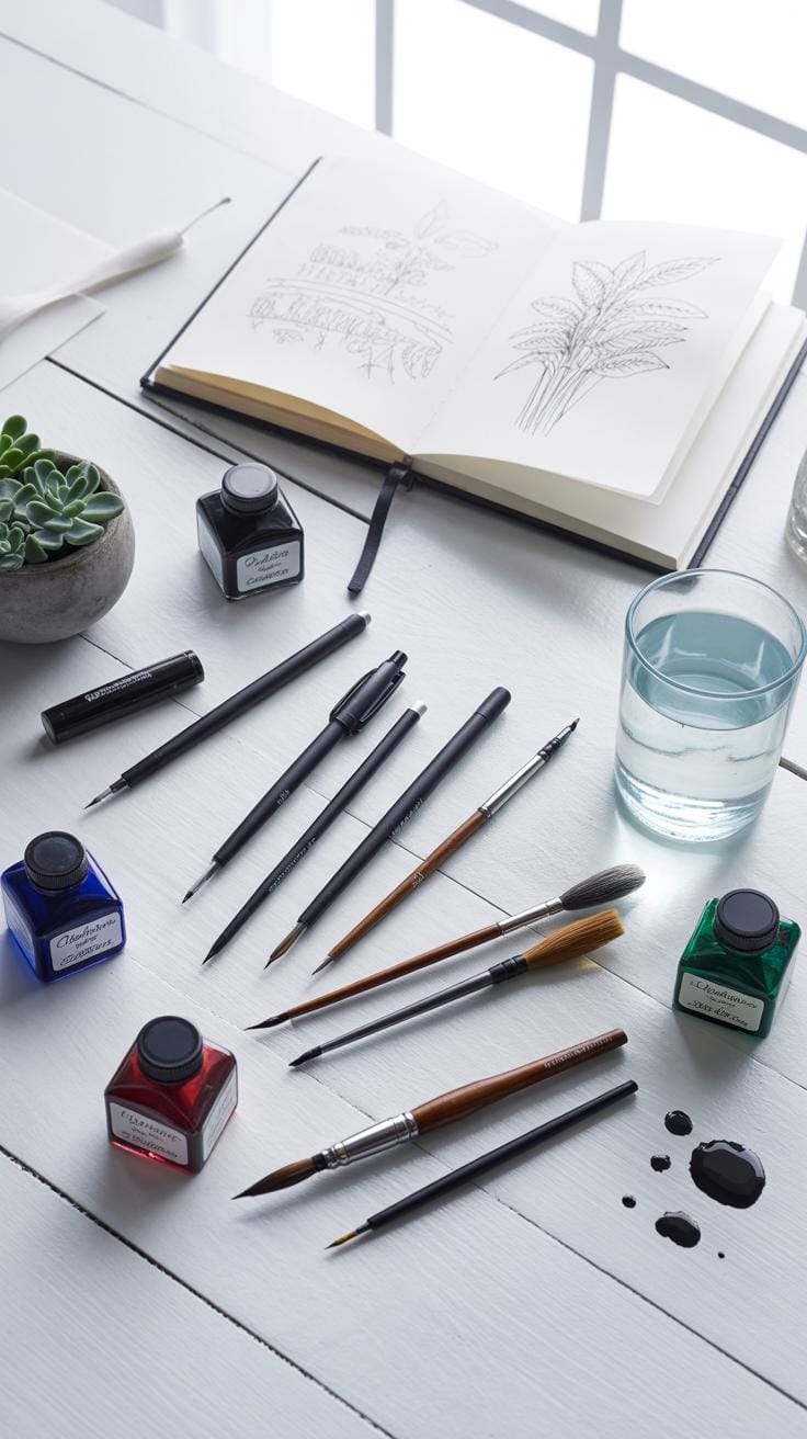 For pens, there’s quite a range: dip pens offer control and variety in line thickness but demand some skill and patience. Fountain pens flow smoothly and feel more intuitive, yet might limit you if you want finer details. Brush pens, on the other hand, bring a dynamic, expressive quality with their flexible tips—perfect if you enjoy varied stroke widths without switching tools constantly.