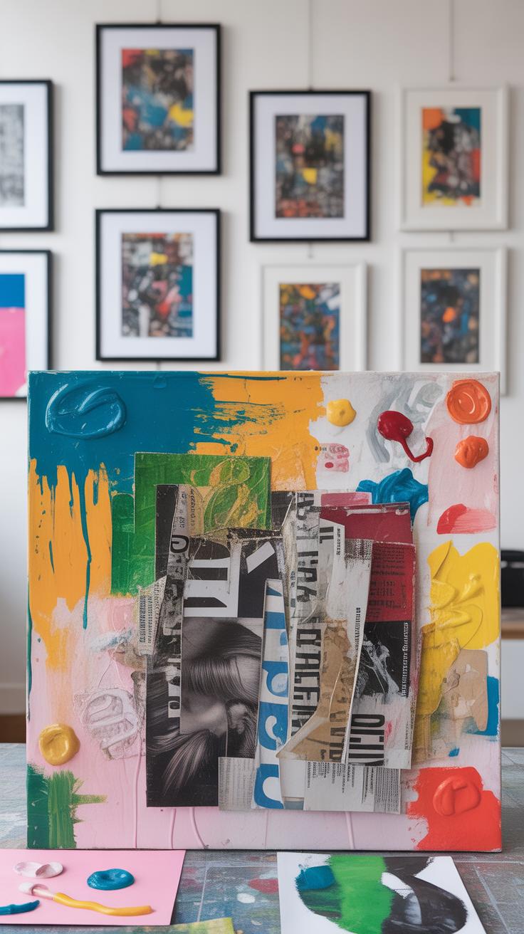 - Use collage as a base layer, then paint or draw directly over and around the images. This can create tension between the realistic photo fragments and the abstract or expressive brushwork.