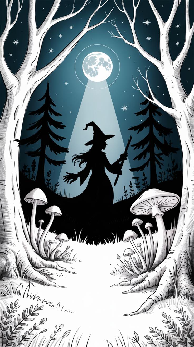 Imagine the moonlight as gentle, cool rays brushing against the Moon Witch’s form. Use a very sharp, light-colored pencil—white, pale blue, or even a silvery gray works well. Apply strokes selectively on edges facing the moon to suggest a soft glow. Don’t overdo it; a delicate hand conveys the effect better than anything heavy.