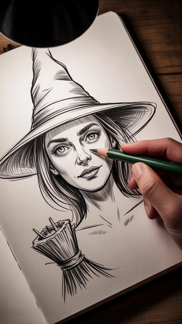 Accessories reveal a lot about the Moon Witch’s identity. Hats with wide brims topped by crescent moons or stars can amplify the magical theme. I try to add texture here—like worn leather or soft velvet—using fine, directional pencil strokes to suggest the material.