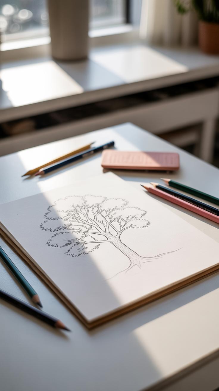 Start by observing your tree carefully. Don’t rush—take a moment to notice its general shape. Is it tall and narrow, or wide and sprawling? Try to capture that overall form lightly on your paper using a soft pencil, like a 2B. Use loose, gentle strokes. You want to block in the trunk first, then the main branches extending outward. Keep these lines faint; they’re guides, not final marks.