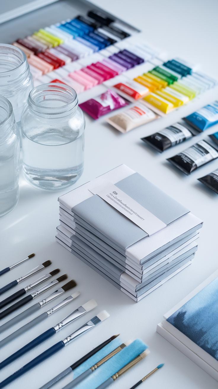 Essential extras include paper towels or rags to blot brushes, masking tape to secure paper, and a pencil for sketching outlines. A spray bottle with water can keep paints moist during breaks.