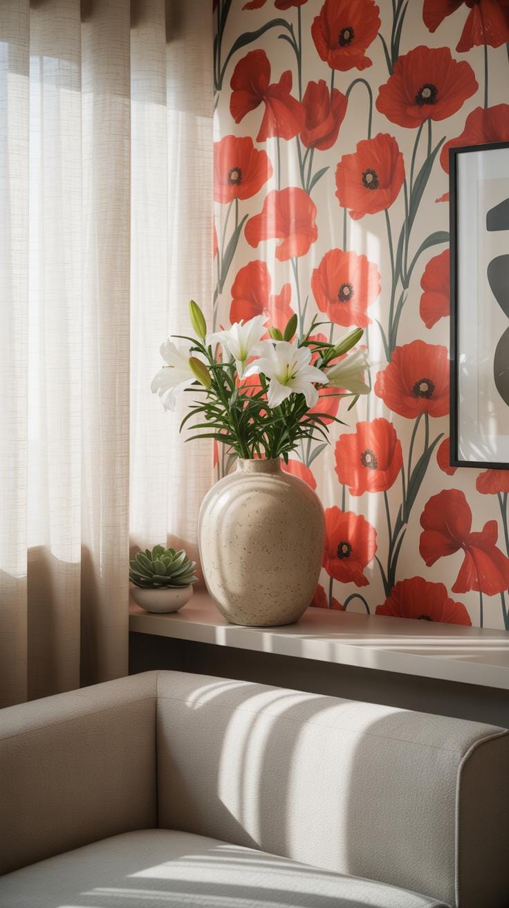 Once the poppy wall is up, the rest of the room needs to quietly step back, so the focus stays where you want it. Think about using furniture and decor in neutral or muted colors; greys, whites, and soft greens often pair nicely. Or you could echo the poppy’s reds or oranges in small accents—like cushions or a throw—but be careful not to overdo it. It’s easy to tip the room towards feeling too coordinated or forced.