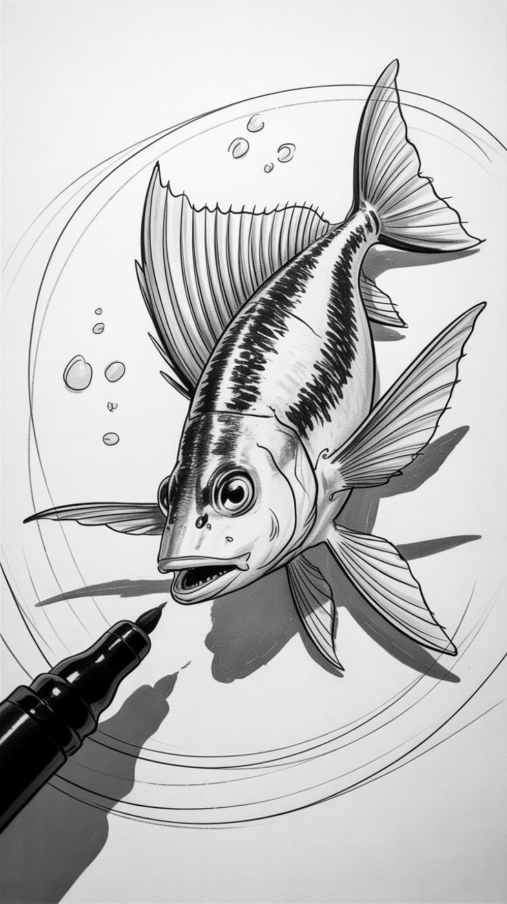 If something looks off, don’t be afraid to redraw it. Maybe the tail is too thick or the fins are oddly placed—light lines mean you can erase these without a fuss. I often find myself redrawing parts several times before feeling satisfied. Sometimes, it helps to step back, look at your drawing from a distance, or even flip the paper upside down. This tricks the eye into seeing things differently.