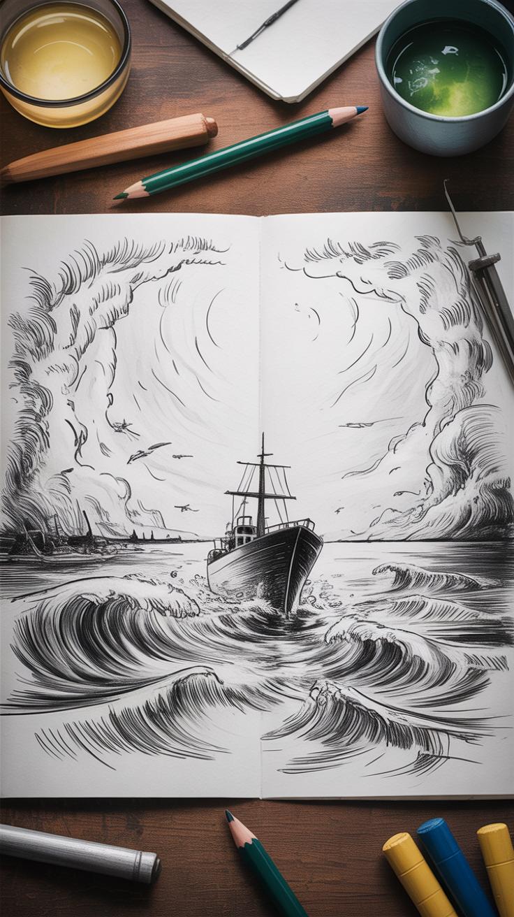 For the water, pencils can capture the rough surface by varying stroke direction and pressure. Quick, sharp lines create the choppy, restless motion of waves. Mixing these with small, circular motions can replicate swirling foam or agitation. Experiment to see how different strokes affect the water’s texture—you might be surprised how just a slight change alters the scene’s feeling.