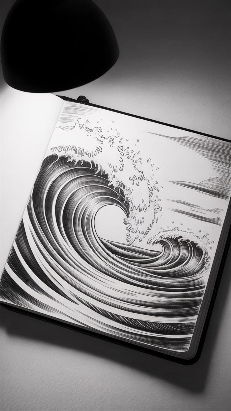 Start by lightly sketching the overall forms with a pencil. Focus on the main wave shapes first — think about the big curling masses of water and how they interact. Don’t worry about details yet; just capture the movement and scale. Imagine the waves crashing with force, their crests sharp or foamy, guiding the viewer’s eye across the page.