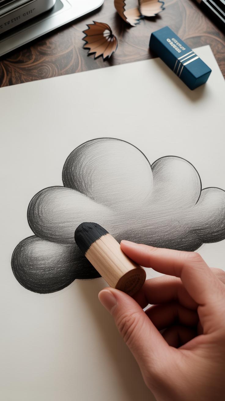 Not all pencils are the same. You’ll find that softer pencils, like 6B or 8B, create dark, rich marks that are perfect for developing shadowy, turbulent cloud masses. Harder pencils, like H or 2H, offer lighter, more controlled lines, useful for finer textures and subtle highlights. This variety lets you build layers—each offering a new dimension of detail.