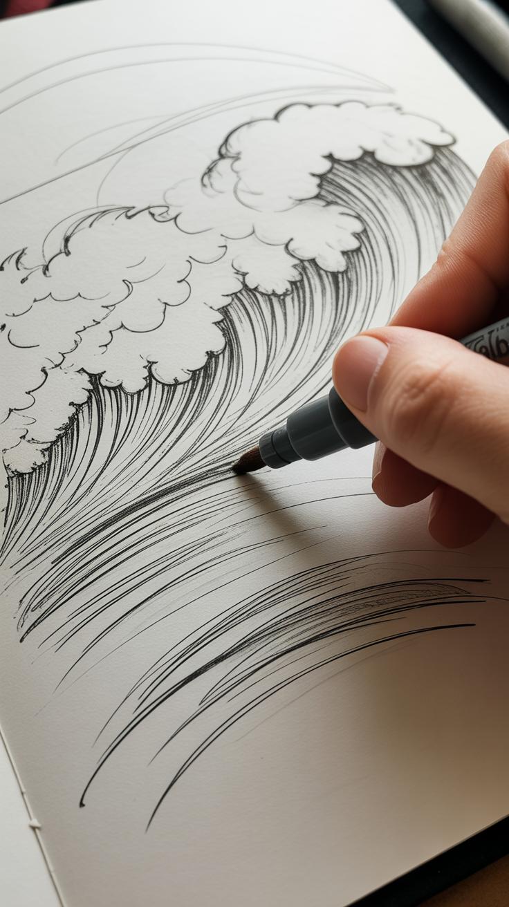 Waves aren’t just lumps of water—they move, curl, and fold back on themselves. Capturing that takes confident, fluid lines. I find it helps to practice short, sweeping strokes that curve lightly but are pulled swiftly. Imagine the edge of a wave lifting foam off the surface. A few quick, irregular lines can suggest foam breaking up with a lively, restless rhythm.