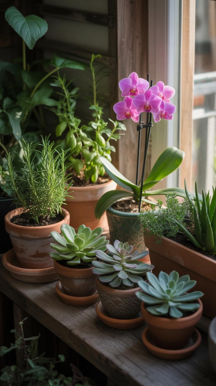 - Wall-mounted shelves holding herbs or succulents in pots