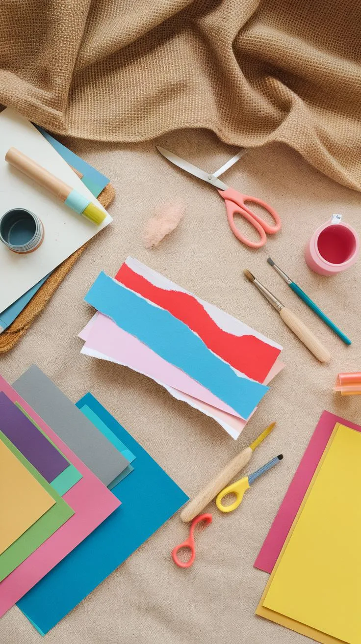 What other materials might inspire your creativity? Collect odds and ends, like fabric scraps or textured elements, to enhance your torn paper art further.