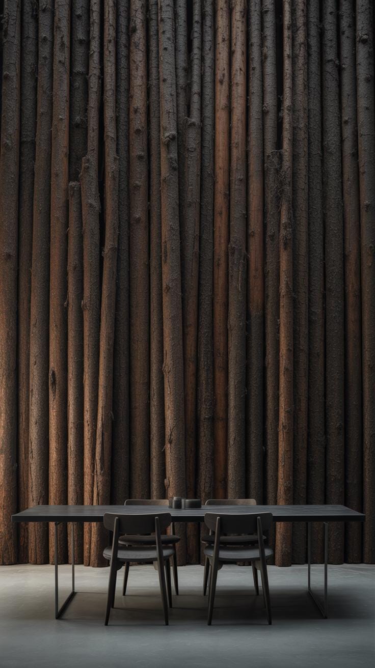 Wood furniture or accents work well because they echo those earthy tones within tree wallpaper. Think raw or lightly finished woods rather than overly polished pieces. You might try: