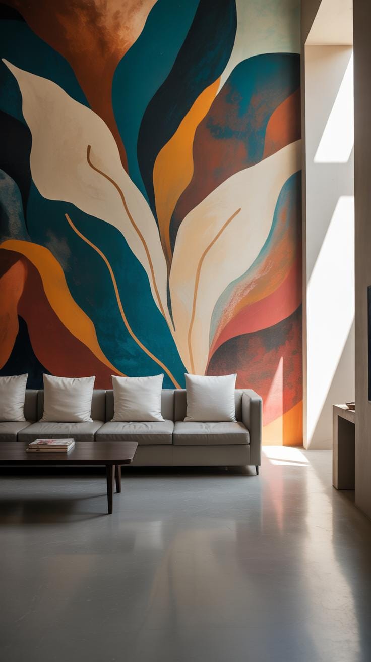 - Keep large furniture pieces in neutral or muted tones so the mural remains the star.