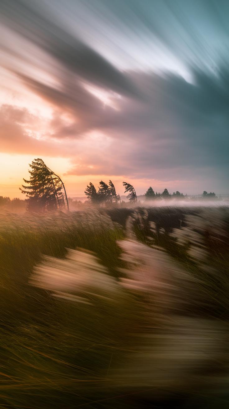 When painting wind, use quick, light strokes in the direction the wind flows. Blend pale blues or grays softly into the background to show clouds caught in the breeze. Work with dry brush strokes to add texture for leaves or grass moving in the air. These details bring your landscape to life.