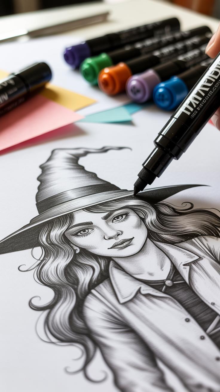 Switching over to fine tips is where your drawing really comes alive. Thin lines bring out the witch’s facial features, the folds in her clothes, or the delicate lace on her sleeves. I find that toggling between broad and fine tips keeps the drawing balanced and detailed without overwhelming the page. For instance, add small shapes like stars on her hat or tiny buttons on her cloak — these little details catch the eye.