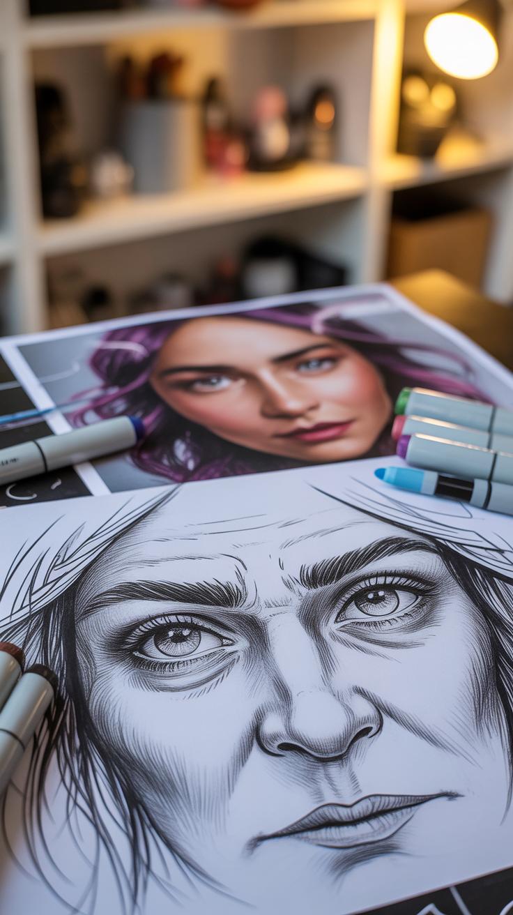 When you’re drawing a witch with markers, adding shadows and highlights really brings the image alive. It’s not just about making the colors darker or lighter; it’s about creating a sense of form and space. Shadows usually gather where light struggles to reach—so, think beneath wide-brimmed hats, the folds and creases of robes, and right under the chin. These areas tend to pull the drawing inward, making it feel more three-dimensional.